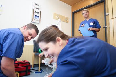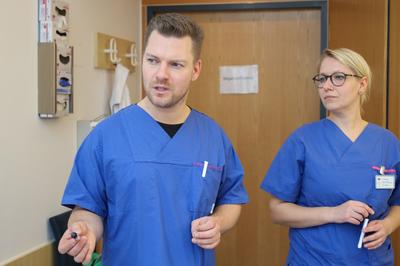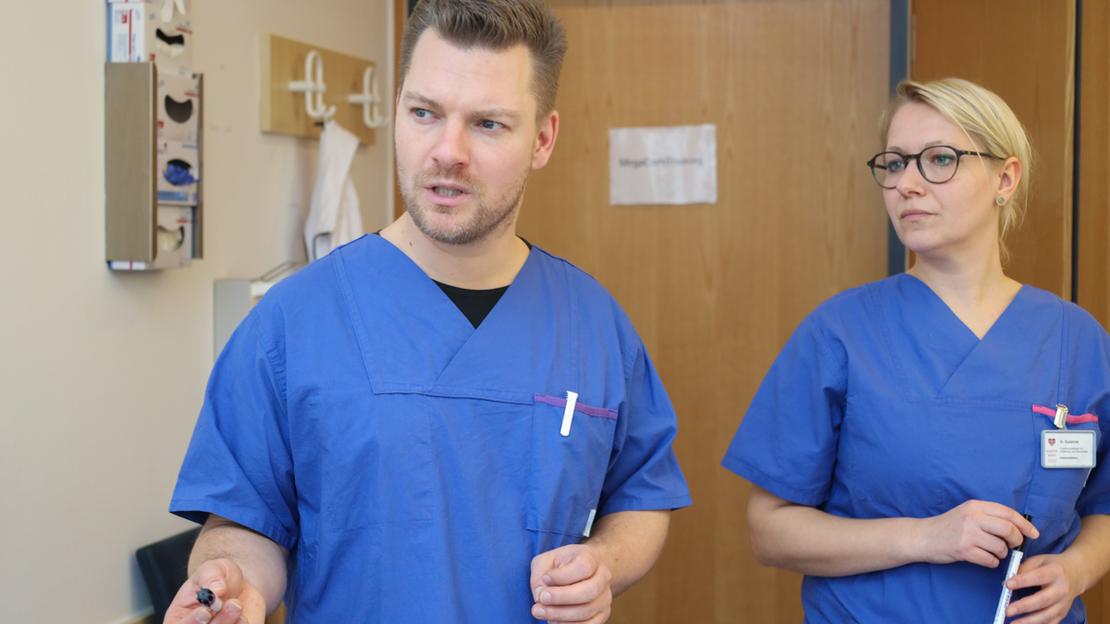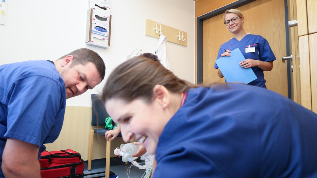 sagt Vincent Dieke. Gemeinsam mit seinem Kollegen Matthias Anger hat er 2018 das Training für erweiterte Reanimationsmaßnahmen übernommen und ausgebaut. Seit zwei Jahren ist auch Susanne Langenhan dabei – alle drei sind extra dafür ausgebildete "Advanced Life Support MegaCode Instruktoren" (ACLS) nach den gültigen ERC-Leitlinien.