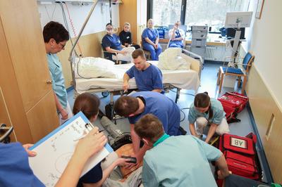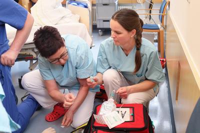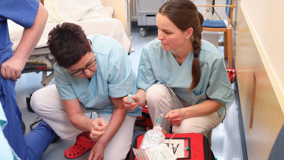 Kommt es bei einem Patienten zum Herzstillstand, zählt jede Sekunde. Bei der nötigen Reanimation heißt es, schnell und professionell zu handeln. Nach den Basismaßnahmen (mit Maske-Beutel-Beatmung und Herzdruckmassage) übernimmt das alarmierte REA-Team der Intensivstation die weiteren Maßnahmen – immer in Zusammenarbeit mit den bereits Anwesenden: